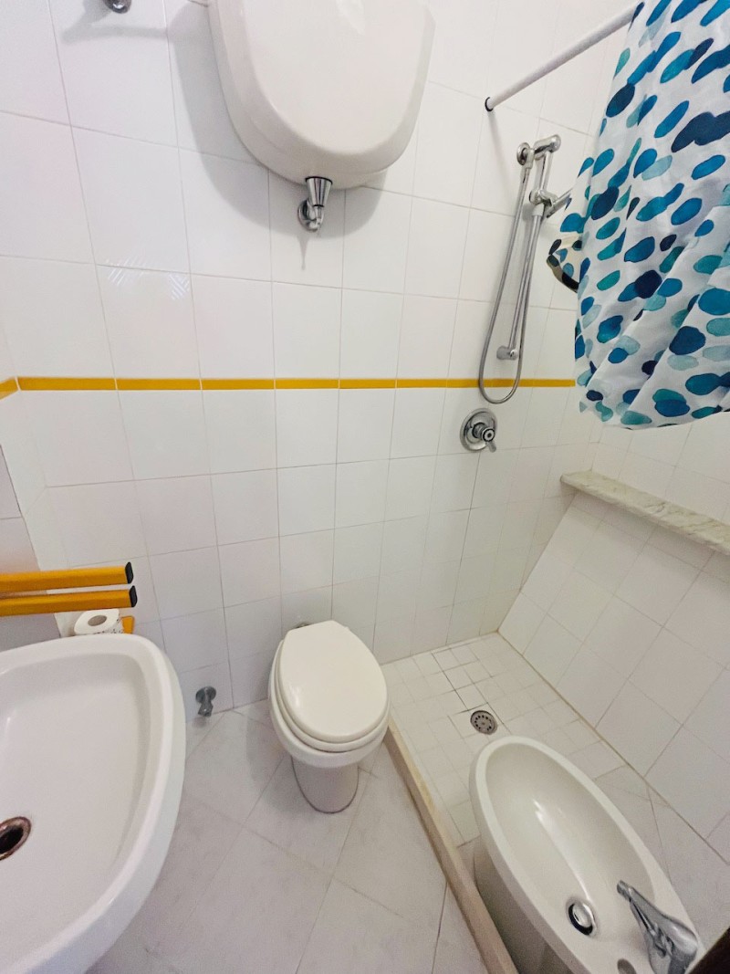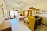 L’appartamento si trova nel complesso “Il Faraglione”, è al primo piano senza ascensore, a un minuto a piedi dalla spiaggia. L’appartamento è composto da una camera matrimoniale, un soggiorno con mobile letto matrimoniale ed angolo cottura, frigorifero a colonna con freezer, tv, lavatrice, due bagni con doccia ed un balcone attrezzato per mangiare fuori con parziale vista mare. La camera matrimoniale è dotata di aria condizionata e la finestra dà su uno spazio interno chiuso di servizio al condominio. In soggiorno sono presenti le pale a soffitto e l'aria condizionata.