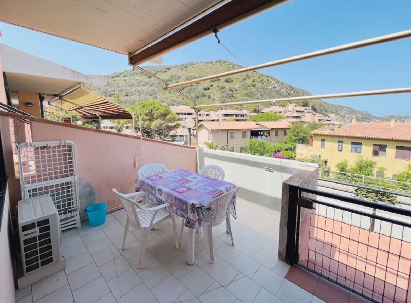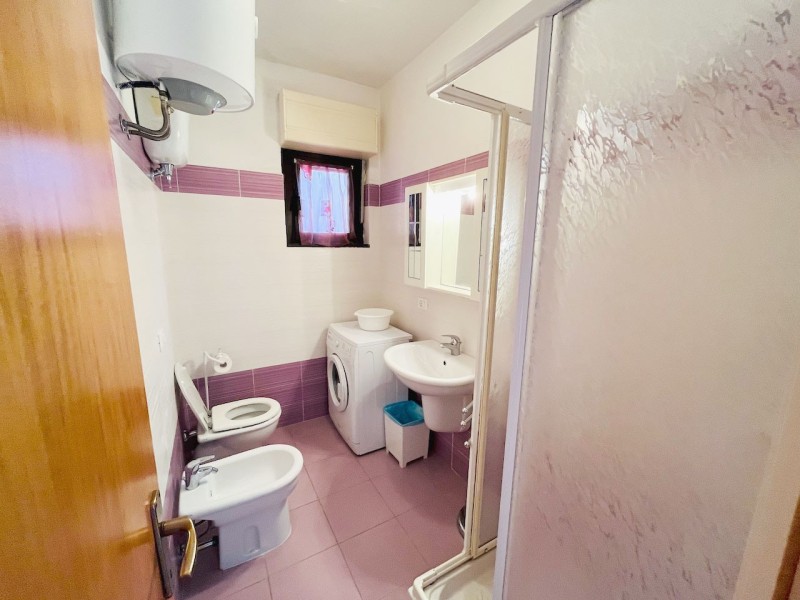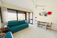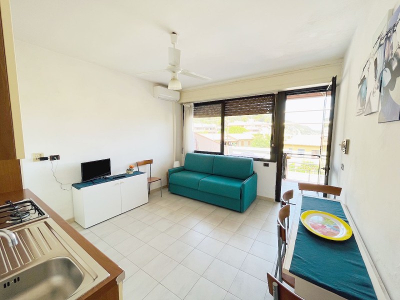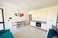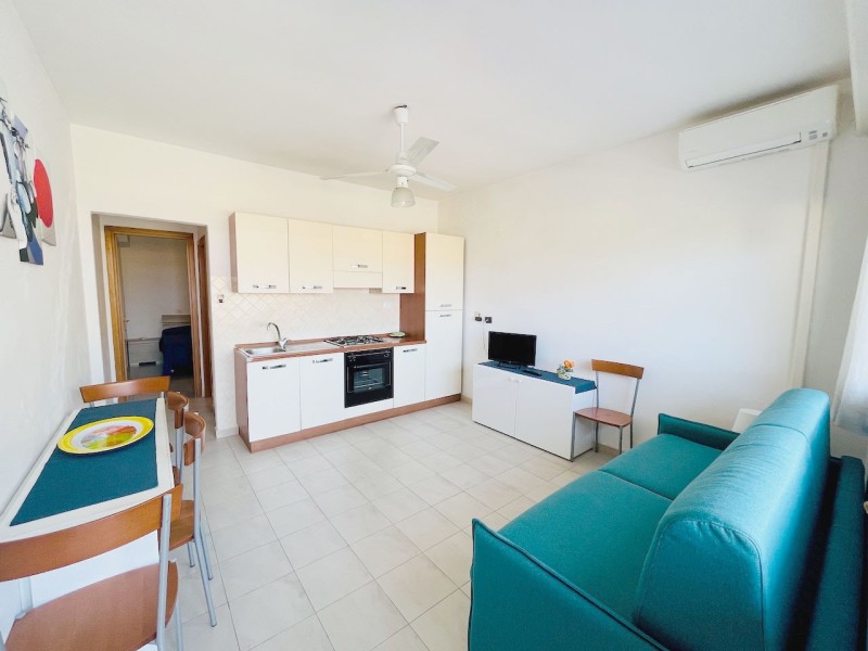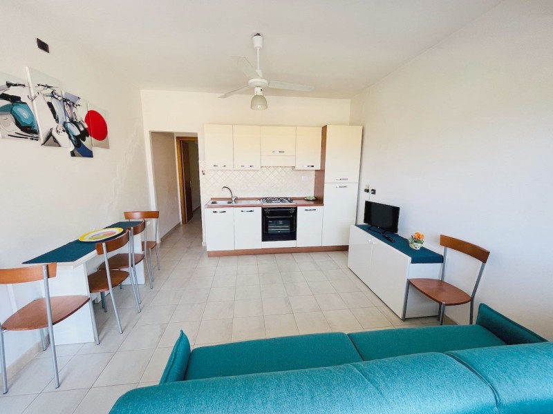 L’appartamento si trova nel complesso "Sirmet", è al primo piano senza ascensore a tre minuti a piedi dalla spiaggia. L’appartamento è composto da una camera matrimoniale con terzo letto, soggiorno con divano letto matrimoniale ed angolo cottura, frigorifero a colonna con freezer, tv, lavatrice, bagno con box doccia e spazio esterno attrezzato per mangiare fuori con parziale vista mare. Le stanze sono dotate di pale a soffitto e aria condizionata. L’appartamento è dotato di posto auto.