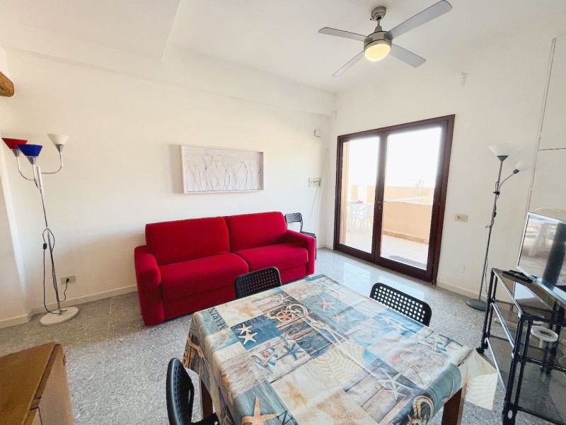 L’appartamento si trova nel complesso “Il Faraglione”, al terzo piano senza ascensore, a meno di due minuti a piedi dalla spiaggia. L’appartamento, l’unico con otto posti letto, è composto da camera con letto matrimoniale, camera con due letti singoli che si possono accoppiare per diventare letto matrimoniale, camera con letto a castello e terzo letto, soggiorno con divano letto matrimoniale e angolo cottura, lavastoviglie, frigorifero a colonna con freezer, tv, due bagni con box doccia e lavatrice. L'appartamento è dotato di pale a soffitto. L’appartamento ha un ampio terrazzo attrezzato per mangiare fuori con vista mare e doccia esterna.